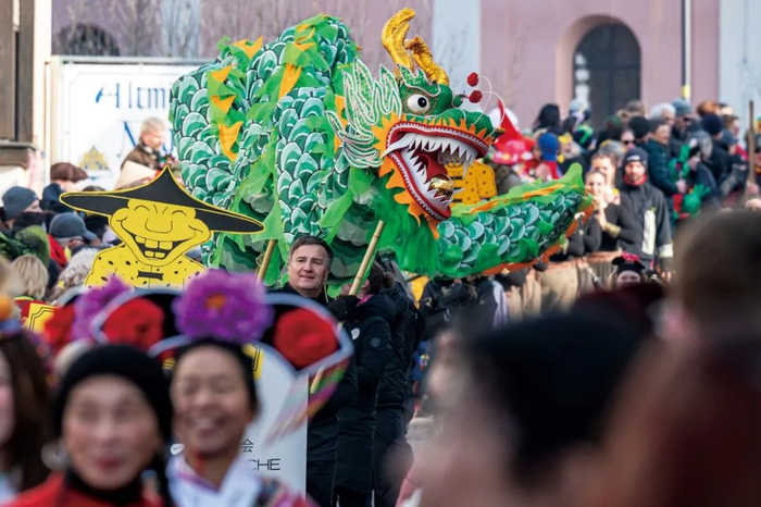 2023年2月16日,德国巴伐利亚州。人们参加在迪特福特举行的富有中国传统特色的狂欢节游行活动。(图/视觉中国)