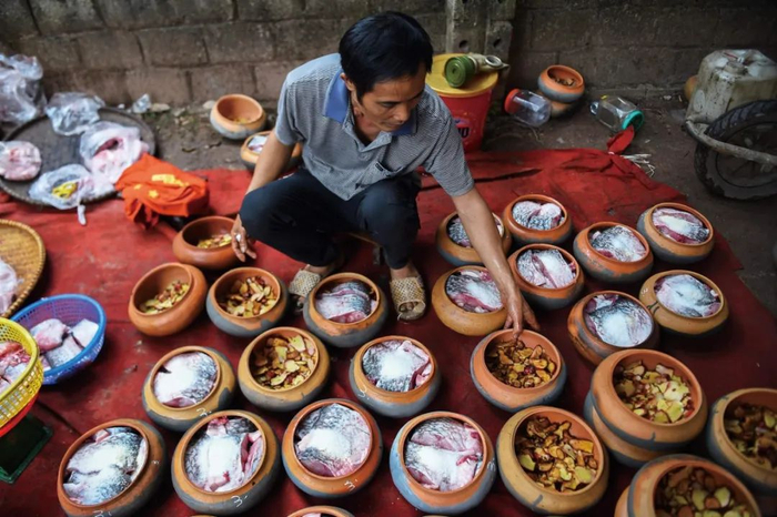 2020年1月21日,越南北部。一名男子在柴火上用陶罐煮鱼。红烧鱼是当地春节期间很受欢迎的美食,每钢售价18-60美元。(图/视觉中国)