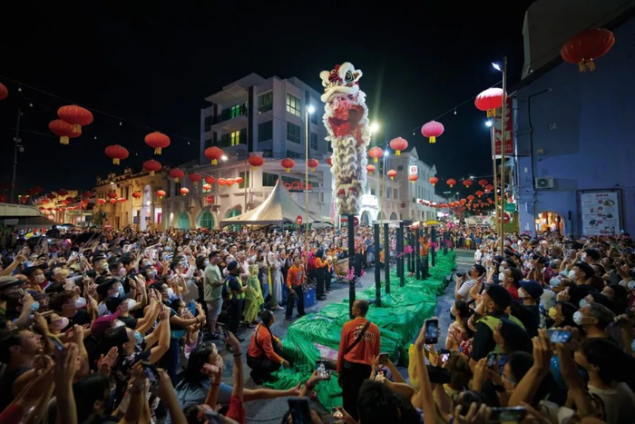 2023年1月28日,马来西亚槟榔屿。槟城庙会上,游客在观者春节舞狮表演。( 图/视觉中国)