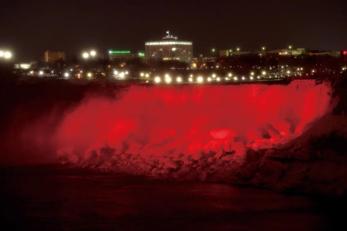 2022年2月2日,加拿大著名旅游最点尼亚加拉大瀑布用灯光点亮“中国红”,庆祝春节。(图/余瑞冬/中新社)