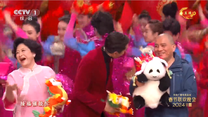春晚观众席上,大熊猫饲养员“谭爷爷”带着花花玩偶一起亮相,“花花”的头上还戴了一顶可爱的龙帽。