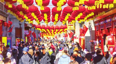 火红的灯笼挂上古色古香的门楼,泥人张世家、杨柳青木版年画、果仁张、耳朵眼……一众老字号店铺鳞次栉比,吸引八方来客。古街上年味儿十足,一派节日气象。