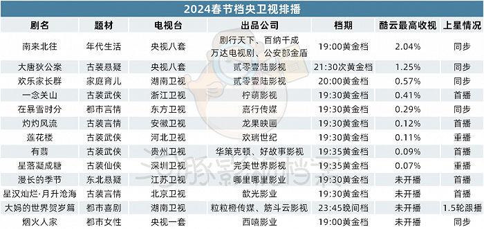 根据河豚影视档案统计今年春节档央视与重点省级卫视黄金档播出剧集,12部电视台春节档剧集中,有7部古装剧、4部都市剧、1部年代剧,除了央视八套的古装悬疑剧《大唐狄公案》被安排在了21点30分的次黄金档之外,其他6部省级卫视都将古装剧安排在了黄金档,这6部中又有4部是首次上星播出。
