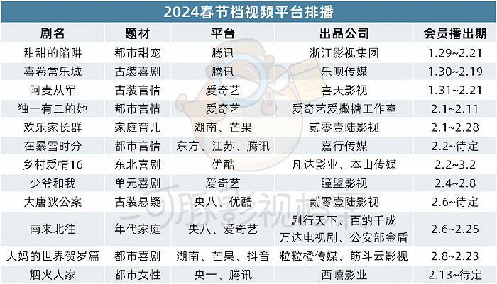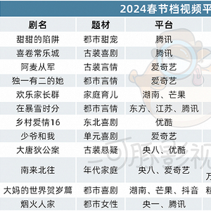 2024年电影春节档预售不如去年,大部分观众只会选择一场电影出门观赏,8天官方春节假期中,剧集春节档是否有机会补足大众的娱乐内容?又是哪些平台、公司在勇闯剧集春节档?