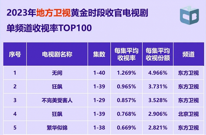 在视频平台制播能力强势、电视台渐处下风后,曾经的“先网后台”形式调转,省级卫视除了湖南卫视黄金档每年仍能保持较高的独播率和首播率,其它省级卫视皆以拼播和购买首轮网播剧为主,去年《狂飙》大爆后,东方卫视与北京卫视紧随央八脚步购入该剧,以1.5轮跟播形式吃到流量红利,收视率分别跻身地方卫视全年黄金档第二位和第四位。
