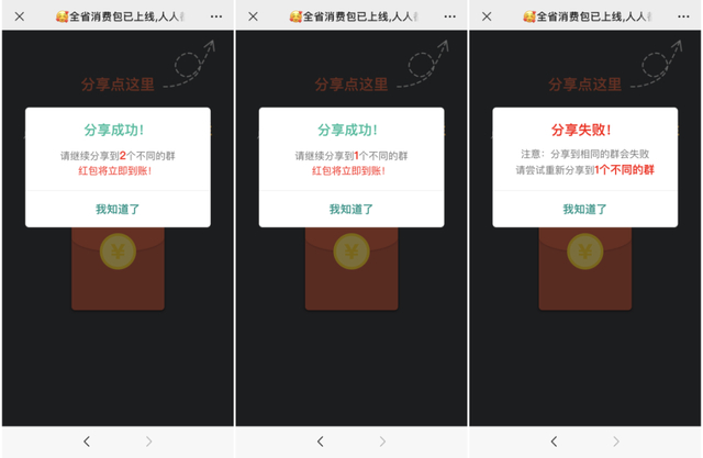 在点击此类红包后,页面提示需要转到其他微信群或分享到朋友圈才能领取。利用微信好友链进行传播,让用户大大降低了警惕,很多人出于对好友的信任,点击后继续分享给其他好友。加上红包流程繁琐,让很多人不愿意“前功尽弃”,造成恶性循环,传播量极广。
