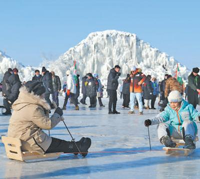 游客在查干湖冰面上体验冰雪那达慕项目。