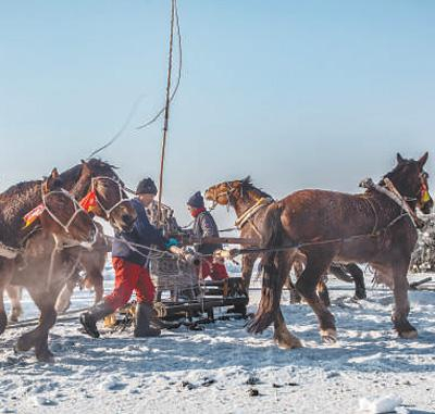 马蹄声中猎渔欢。冰捕现场出鱼口附近,4匹高大健硕的马正拉着绞盘打转,浓密的鬃毛上结着冰霜,在阳光下闪闪发亮。