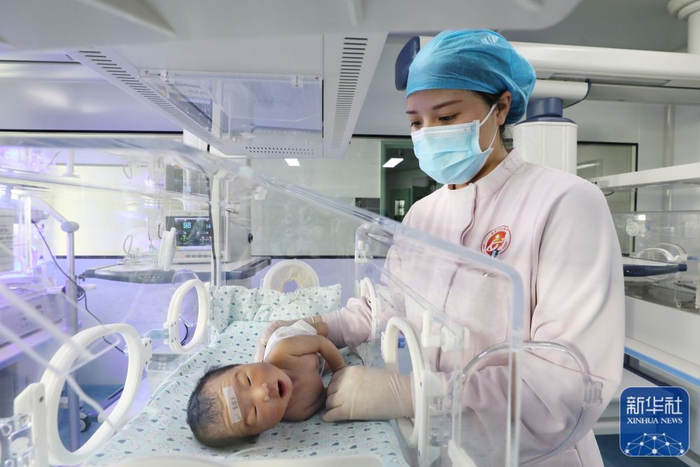 2月9日,河南省焦作市温县妇幼保健院的护士在护理新生儿。