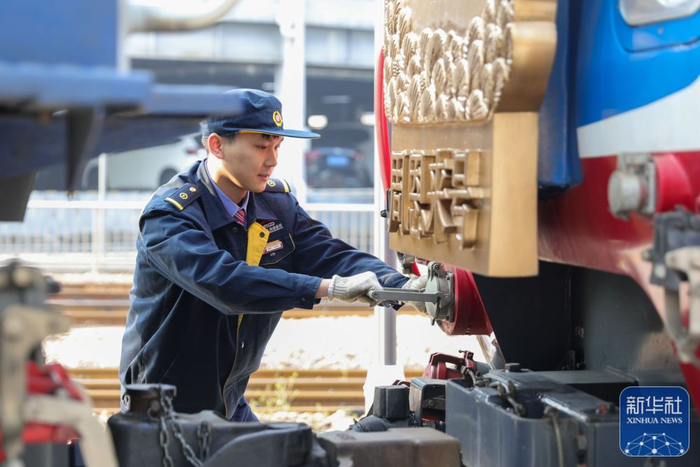 2月10日,上海机辆段“周恩来号”机车组司机对机车进行检查。