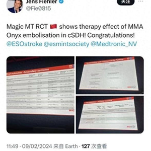 为此,欧洲微创神经治疗协会(ESMINT)前任主席Jens Fiehler教授对MAGIC-MT研究结果给予高度评价称“中国研究者这项神奇的MAGIC-MT随机对照研究,展示了通过Onyx栓塞脑膜中动脉治疗慢性硬膜下血肿的治疗效果!祝贺!”