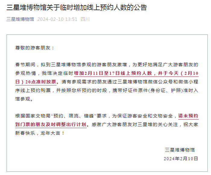 2月10日,三星堆博物馆微信公众号发文称,春节期间,拟到三星堆博物馆参观的游客朋友激增,三星堆博物馆决定临时增加2月11日至17日线上预约人数。