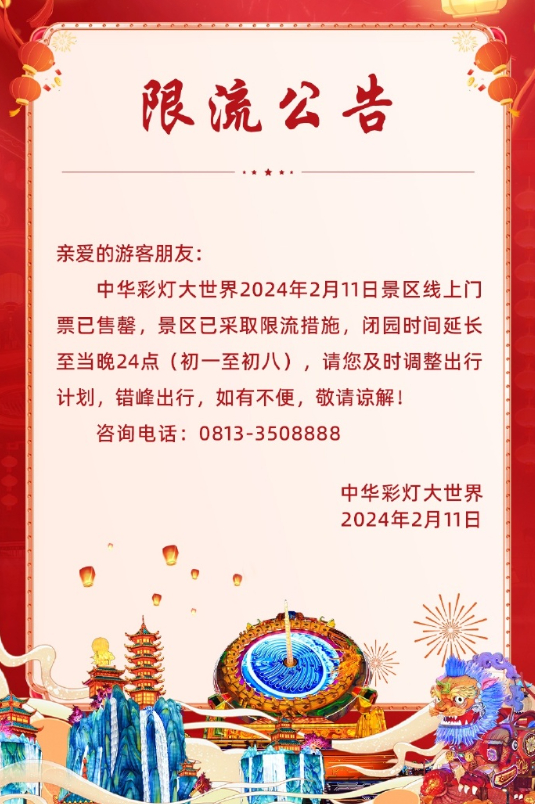自贡中华彩灯大世界官方微博11日发布消息,中华彩灯大世界2024年2月11日景区线上门票已售罄,景区已采取限流措施,闭园时间延长至当晚24点(初一至初八)。