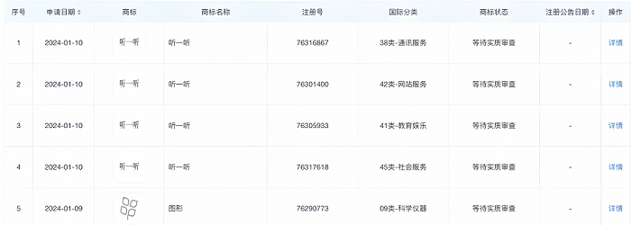 同时,天眼查显示,腾讯科技(深圳)有限公司已申请注册“听一听”商标,国际分类为通讯服务、科学仪器等,当前商标正在等待实质审查。