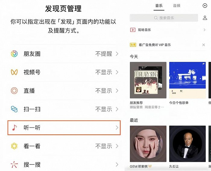 作为“发现”页的全新入口,“听一听”的默认位置在“扫一扫”下方、“看一看”上方,点击后会进入音乐和音频界面。未被灰度测试覆盖的用户,则需要在聊天页面下拉,即可在页面最上方找到“音乐”“音频”“最近播放”三个标识,其功能与“听一听”完全重叠。