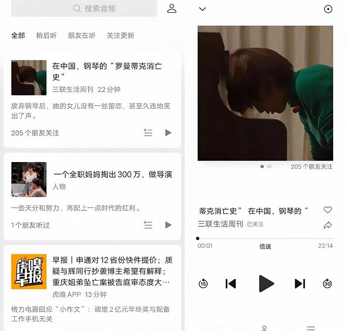 此外,在音频板块,主要由AI朗读公众号文章,关注公众号的朋友数量则为推荐标准。用户可以设置稍后听,浏览朋友在听的音频内容,以及所关注公众号的内容更新。在播放界面,右滑可以进入公众号原文,但功能十分简洁,如AI声源还仅有单一的男声。