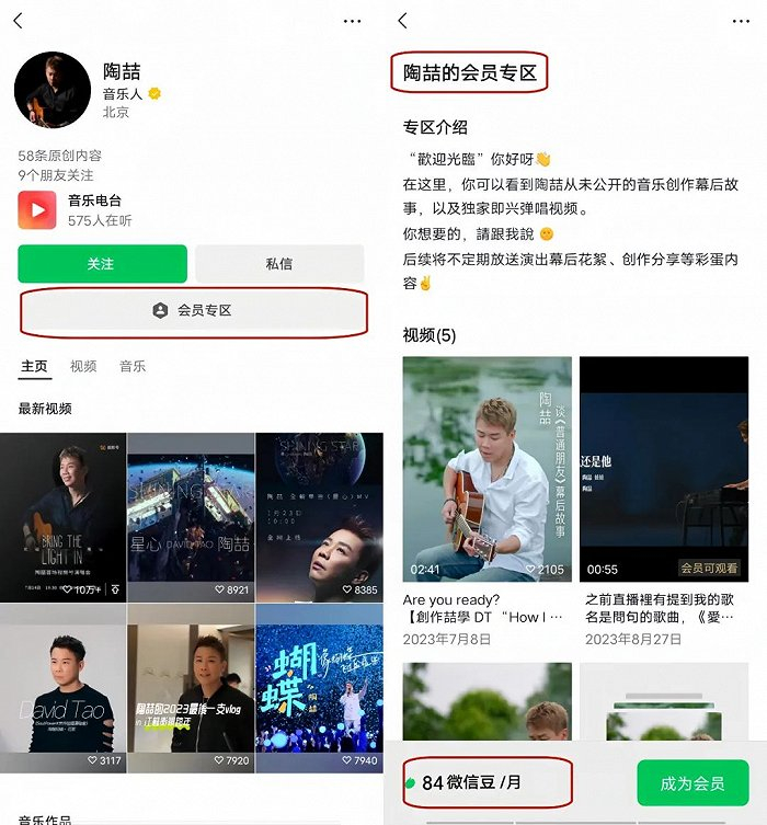 在后端,视频号官方私信内容创作者,邀请其开通“会员专区”功能;在前端,个人主页上方会展示会员专区入口。用户通过微信豆按月付费订阅,创作者则可以发布会员专属内容,还可以使用会员问答功能与用户进行双向互动。比如陶喆的会员专区定价为84微信豆/月,折合12元/月。