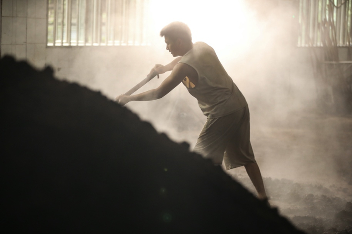 约一个小时后,酒醅的温度下降,于是窖工们用铁铲把它们堆成一个约1.8米高的堆子,是为“堆积”。这是一些身材不高、体格健硕的家伙,你仔细观察会发现,他们两臂的肌肉尤其厚实,这当然是常年翻沙的结果。在川贵酒坊,“沙”是当地方言,指的不是石沙,而是高粱。