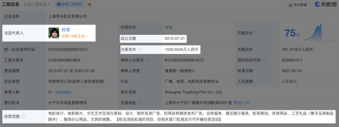 天眼妹查了下发现,作为出品方之一的上海亭东影业有限公司成立于2015年7月21日,注册资本为1520.5046万人民币,经营范围包括电影发行、电影制片等。该公司的法定代表人同该部影片的导演、编剧相同,都为韩寒。