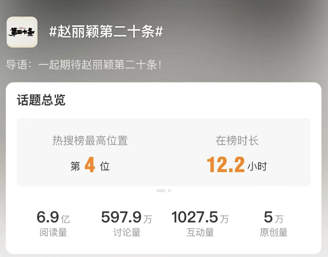 作为该部影片的主演之一,赵丽颖首次挑战“哑女”角色,引起广泛关注。早在2024年1月25日,#赵丽颖第二十条#的微博话题阅读量便已达6.9亿。