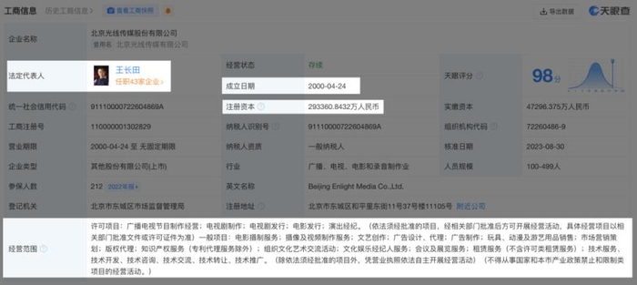 光线传媒成立于2000年4月24日,法定代表人为王长田,注册资本为29.33亿,经营范围包括广播电视节目制作经营、电影摄制服务等。