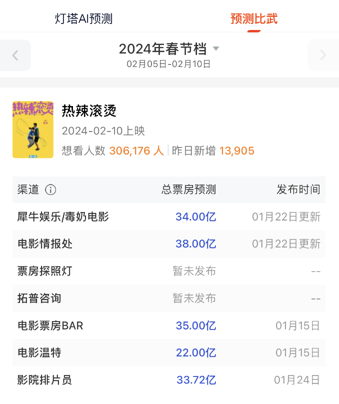 节前,灯塔专业版平台的数据显示,在几个电影自媒体对《热辣滚烫》的票房预测中,总票房数据均超30亿,最高为38亿。