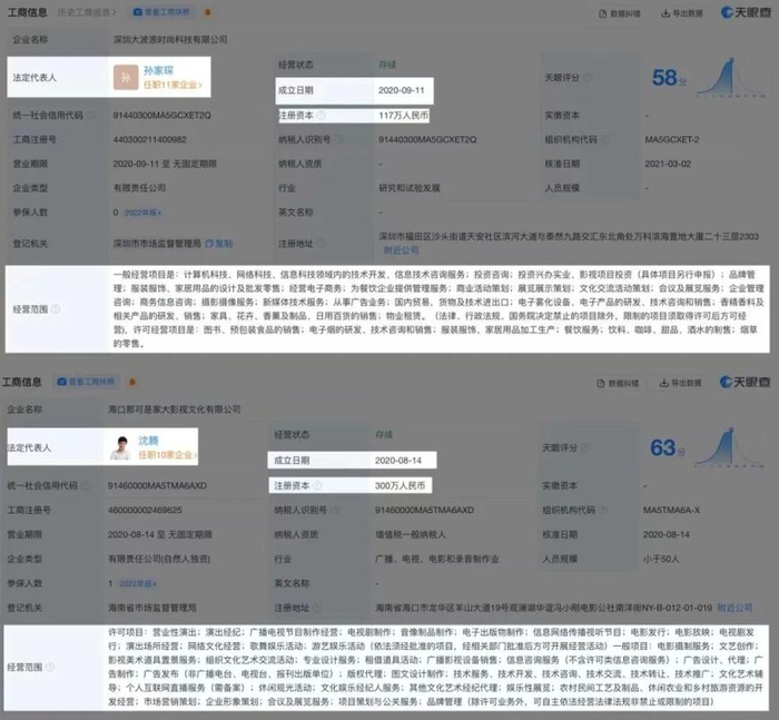 值得注意的是,沈腾不仅投资过一个名为“深圳大波浪时尚科技”的公司,还在2020年8月14日创立了一个名为“海口那可是家大影视文化有限公司”的企业。