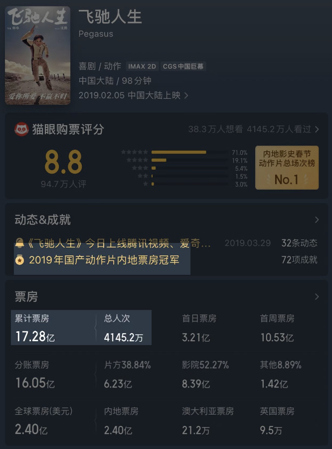 2019年春节档,该影片的前序之作《飞驰人生》上映。根据猫眼电影公布的数据,《飞驰人生》累计票房达17.28亿,观看总人次为4145.2万人,还拿到了2019年国产动作片内地票房冠军的奖项。