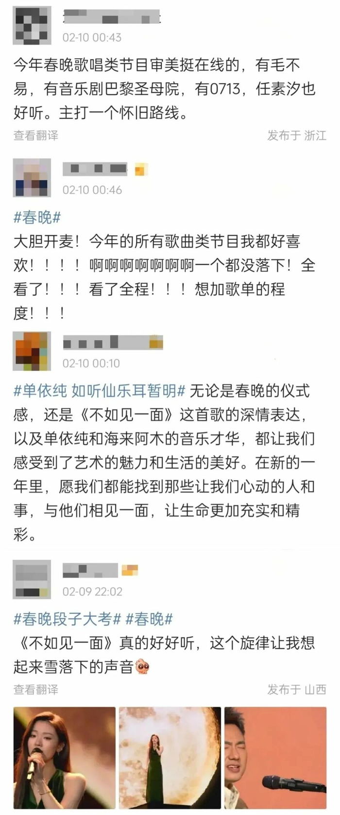 春晚副总导演赵大治谈到,做到歌声“此起彼伏”,是民歌节目希望达到的效果。而如《枕着光的她》这种风格的歌曲,表演者如果自己在舞台上就会显得单薄。“把歌曲调到观众席里来演唱,是希望营造一个小型演唱会的氛围感,把‘气’拢起来,让歌曲更暖。”一份曲风各异的歌单,有热情高歌,有低吟浅唱,春晚舞台的二次创作将歌曲变得更加好听好看,其中蕴含的情绪也更加丰富和真实。