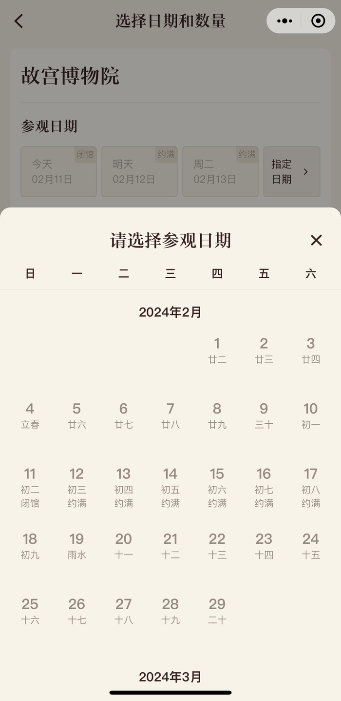 故宫博物院门票预约页面。整个春节假期都已约满。