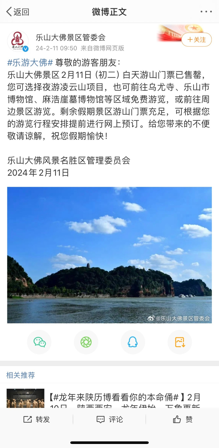 当日上午9:50,乐山大佛景区管委会就发布消息称:“白天游山门票已售罄,您可以选择夜游凌云山项目,也可前往乌尤寺、乐山市博物馆、麻浩崖墓博物馆等区域免费游览,或前往周边景区游览……”