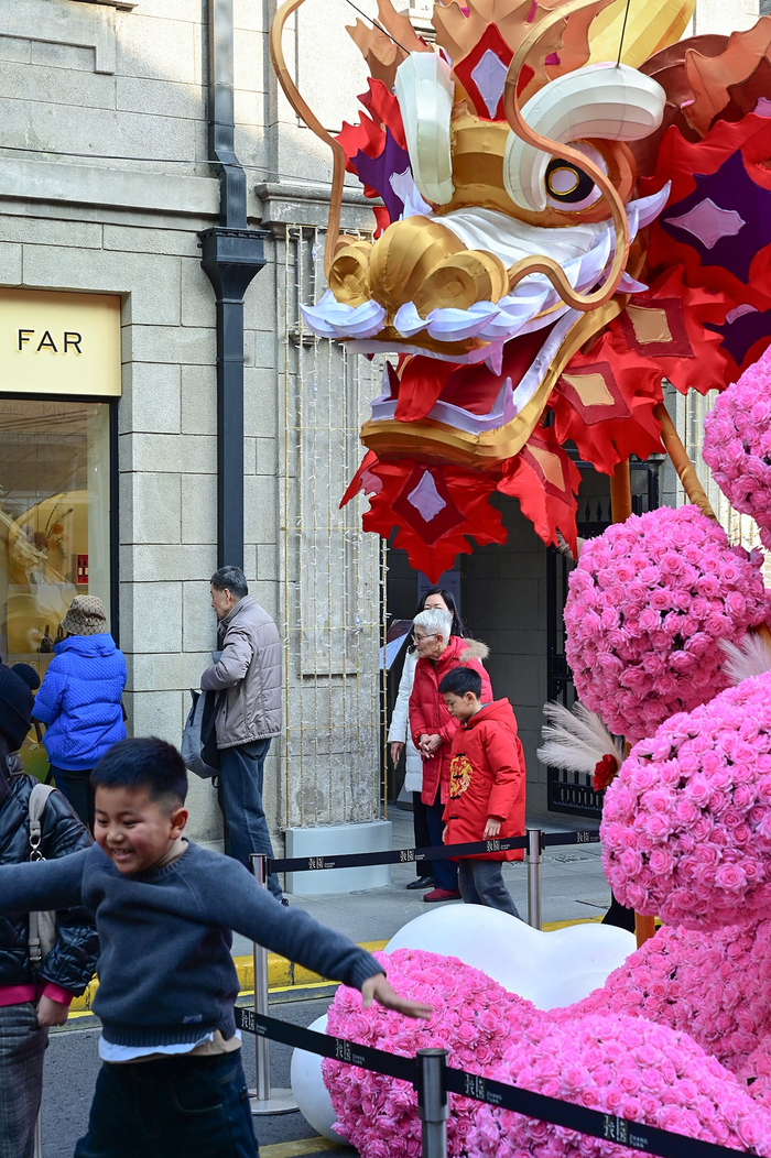 2024年2月10日,上海茂名北路。在“巨龙”头前蹦跶的孩子和马路上的游人。
