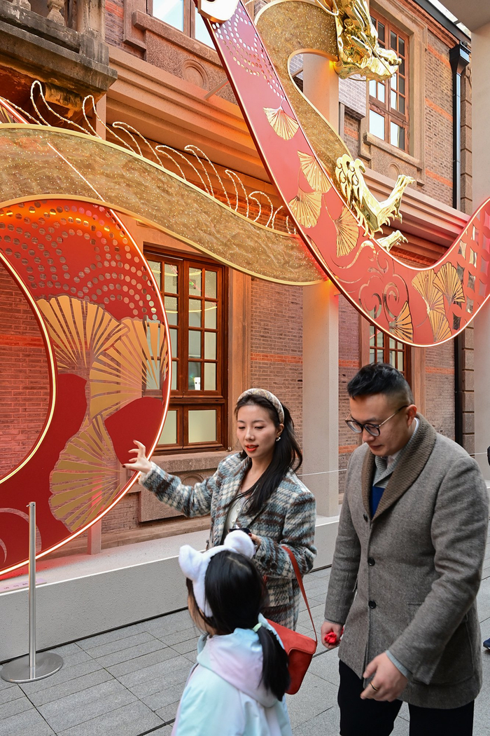 2024年2月10日,上海茂名北路。张园里,在一处龙形装饰前,妈妈正在给孩子比画“龙爪”。