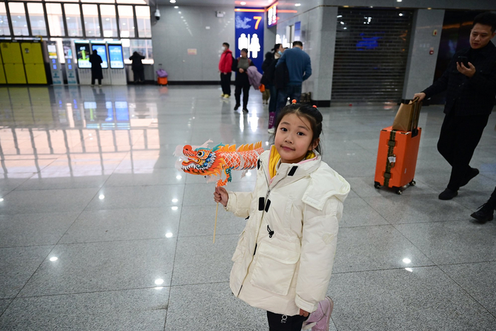 2024年2月10日,上海站。一个手持纸龙的女孩。