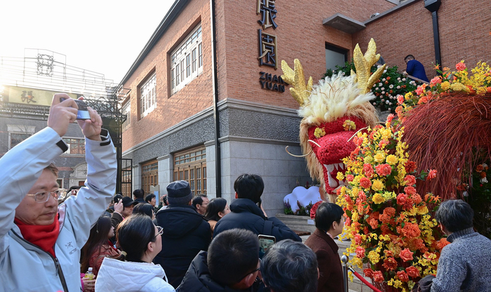 2024年2月10日,上海茂名北路。张园里,人们正在由花艺绿植装扮的“繁花灵龙”前打卡。