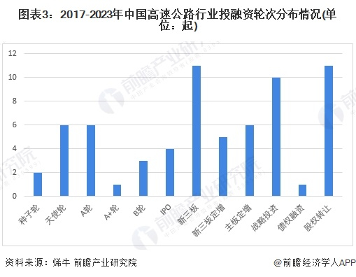 从高速公路的投融资轮次分析,目前高速公路行业的投融资仍处于成长阶段。从代表企业投融资事件轮次分布情况来看,2017-2023年行业投融资轮次主要集中在新三板和股权转让上,但上市前的投融资事件较少,尤其是B轮后的融资。此外,战略投资环节事件数量也相对较多。