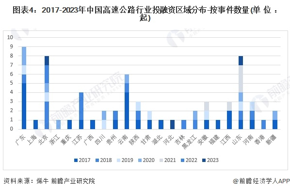 从总体上看,我国高速公路行业的融资区域较为分散,2017-2023年我国34个省级行政区(含港澳台)中23个都有融资事件发生,其中有14个省市融资事件未超过2起。融资事件数最多的地区是广东,2017-2023年累计达到9起,其次为北京和山东,2017-2023年融资事件均为8起。