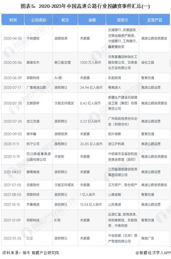 2020年-2023年我国高速公路行业的主要投融资事件如下: