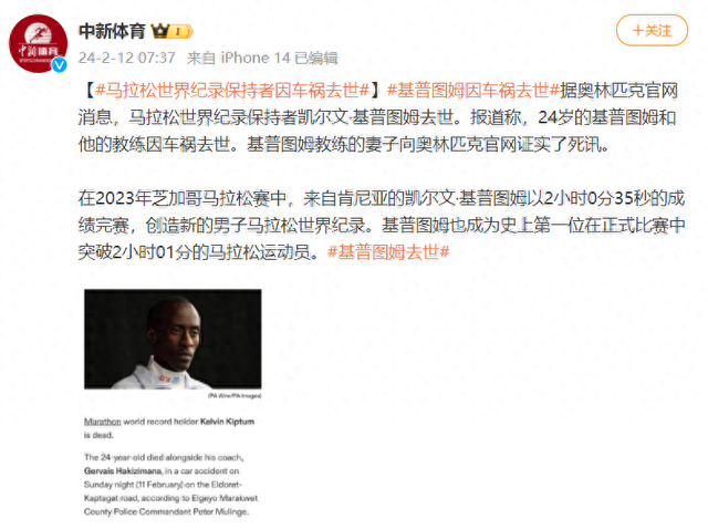 据奥林匹克官网消息,马拉松世界纪录保持者凯尔文·基普图姆去世。报道称,24岁的基普图姆和他的教练因车祸去世。基普图姆教练的妻子向奥林匹克官网证实了死讯。