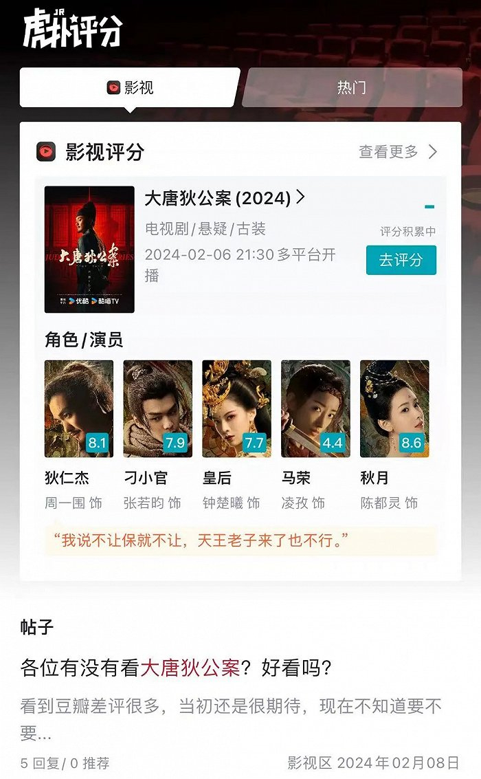 流水最近入坑《大唐狄公案》也有相似理由。这部春节档大剧讲的是狄仁杰进京入仕、全国游历探案的故事,曾凭借一个预告片吊足观众胃口,上过好几次微博热搜。但流水告诉硬糖君,关注这部作品是因为“它在虎扑2024年最期待剧集的榜首,还是悬疑烧脑的推理探案类型”。