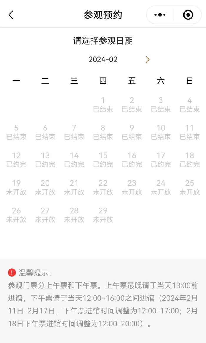 据苏州博物馆小程序显示,2月12日(初三)至18日(初九),苏州博物馆本馆所有时间段均已约满,2月19日闭馆。