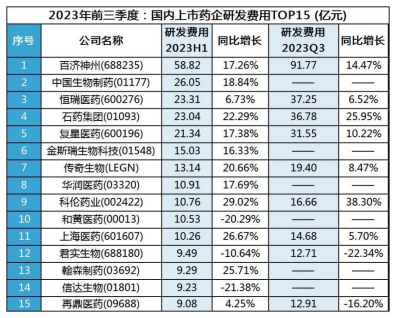 据《医药经济报》新媒体中心统计,在上半年研发费用靠前的15家国内上市药企中,头部企业的研发投入门槛已经提高至10亿元。整体上看,百济神州的研发投入依旧“断层式”领先;大部分药企的研发费用仍然呈现同比增长态势,但君实生物、再鼎医药等创新药企出现收缩聚焦;老牌药企石药集团、科伦药业等持续发力,同比增长幅度扩大至30%上下。