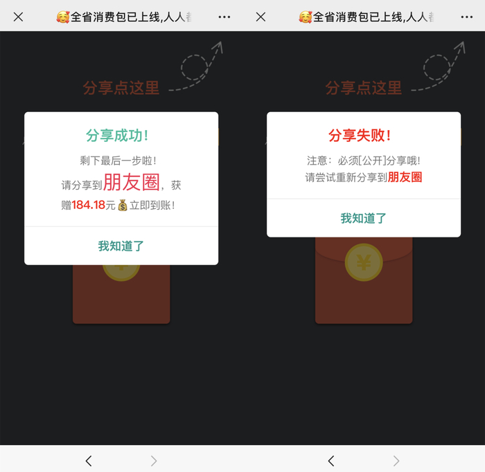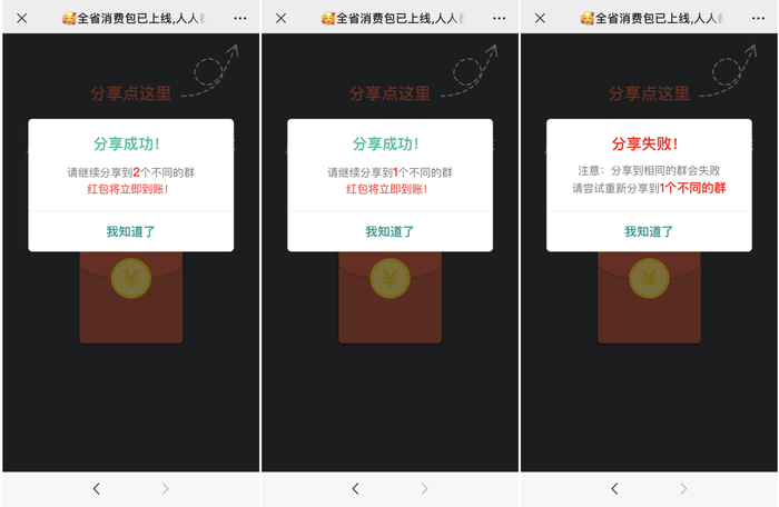 在点击此类红包后,页面提示需要转到其他微信群或分享到朋友圈才能领取。利用微信好友链进行传播,让用户大大降低了警惕,很多人出于对好友的信任,点击后继续分享给其他好友。加上红包流程繁琐,让很多人不愿意“前功尽弃”,造成恶性循环,传播量极广。
