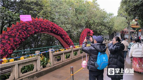 下了索道,步行数十米,就可看到人们争相打卡的鲜花“龙行龘龘”鲜花景观。用玫瑰和海棠作为龙身装饰,旁边摆放着金黄的大花惠兰点缀,将云南的鲜花元素与龙年龙门图腾完美结合的16米长龙呈现眼前。市民游客无不侧目或驻足观赏,而威武帅气的龙头位置,是最佳拍照点,人们比爱心、竖大拇指、剪刀手、摸龙身……打卡姿势也各不一样。