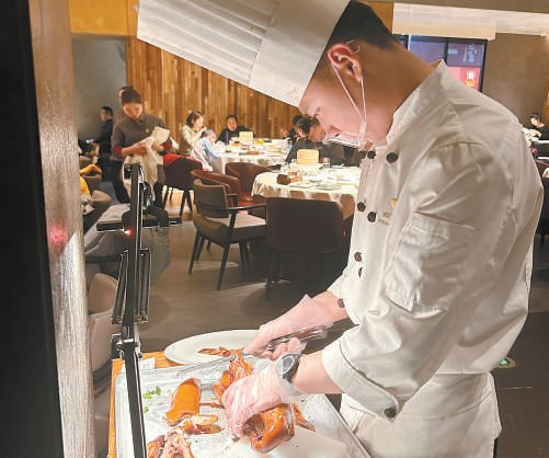 门店大堂里热闹非凡,盛世牡丹烤鸭、精品烤鸭、芥末鸭掌等招牌菜几乎桌桌必点,除了堂食,门店还提供烤鸭礼盒,也是按照“盛世牡丹”形状手工片制,还搭配卷饼和甜面酱,也引来游客争相购买。