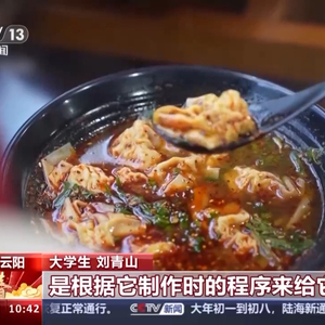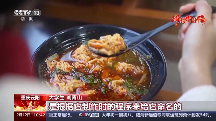 大学生 刘青山:云吞、馄饨、抄手……只有在云阳,才叫它包面。因为我们重庆人比较直接,是根据它制作时的程序来给它命名的。我们在做包面的时候就是把它的三头一左一右,再这样一折合,然后就叠好了,所以就叫它包面了。