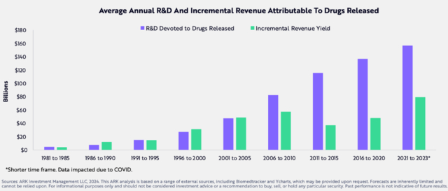 Ark指出,过去的二十年来,精准治疗、CRISPR基因编辑、RNA治疗和靶向蛋白质降解的新模式激增,在人工智能(AI)、CRISPR基因编辑和新测序技术驱动下,创新疗法增加了研发的回报,一些原本被认为无法靶向药物治疗的疾病,现在可以被新开发的药物治疗,为某些疾病提供了新的可能性:
