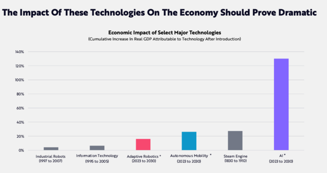 在这份长达163页的报告中,“木头姐”继续把目光锁定“颠覆性创新技术”领域,预计技术融合、AI、数字钱包、精准疗法和3D打印等将改变世界的方方面面,到2030年科技将推动世界经济加速至7%: