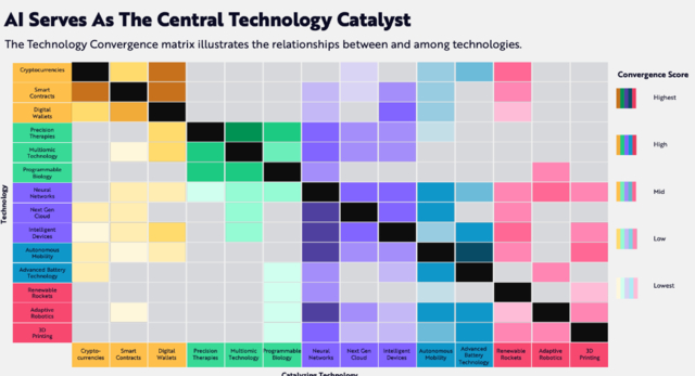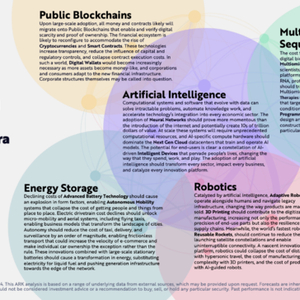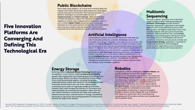根据ARK的研究,颠覆性技术的融合将定义下一个十年的发展,五个主要技术平台——AI、公共区块链、多组学测序(Multiomic Sequencing)、能源存储和机器人——正互相融合,改变全球经济活动,经济增速可能从过去125年平均3%加速至未来7年的7%: