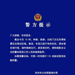 目前因钟楼周围景区人流量车流量较大,城区内车辆缓行,请前往城区内的旅客尽量换乘公共交通工具。执勤民警正在积极疏导分流,请过往车辆听从指挥,择路绕行。